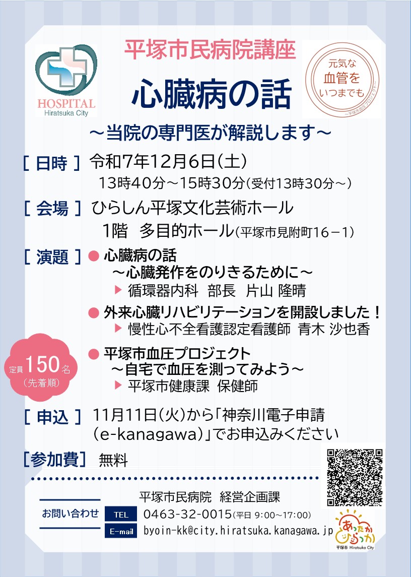 平塚市民病院では、地域の皆さんが病気や医療についての知識を深め、健康増進、維持に役立てていただけるよう院内のスタッフが分かりやすくお話しする「平塚市民病院講座」を開催しています。