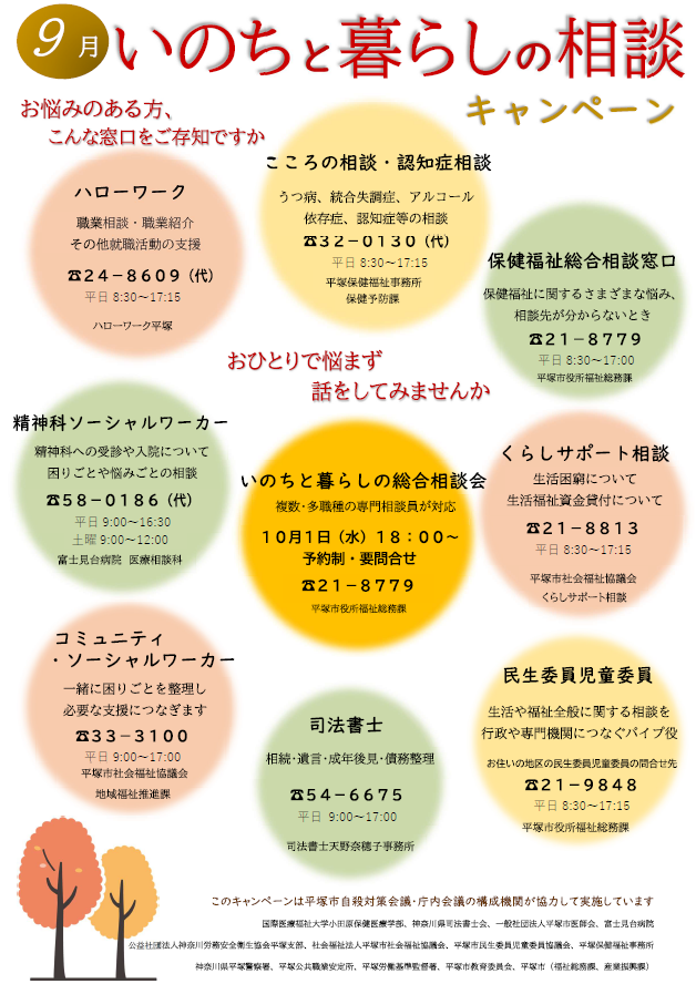 直通電話:0463-21-9862(福祉総務担当) /0463-21-9848(地域福祉担当) /0463-21-8779(福祉総合相談担当)