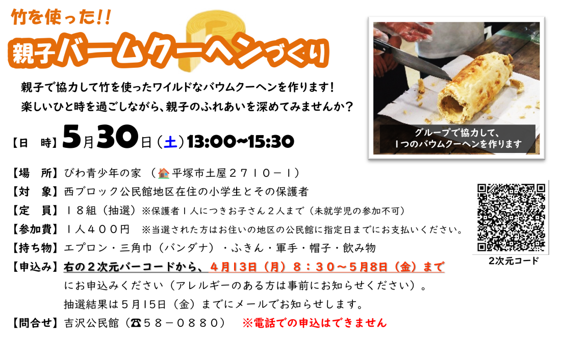 - 【募集】竹を使った!親子バームクーヘンづくり
