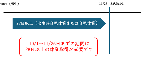 - 子の出生後から8週を経過するまでの期間に出生時育児休業または育児休業を4週間(28日)以上取得すること