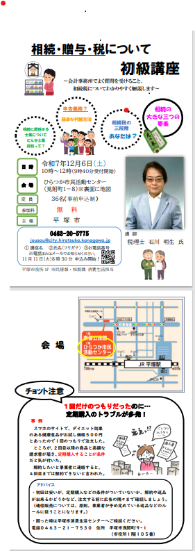 【担当】平塚市役所本館1階 市民情報・相談課 消費生活担当