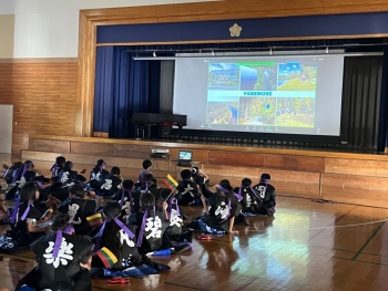 港小学校からは、秋の一大イベントである運動会について紹介。今年の運動会で4年生児童が演技したという、港地区の伝統的な踊り「須賀どっこい」を披露しました。息の合った演技とその迫力に、パネムネ小学校の児童からは感嘆の声が上がりました。