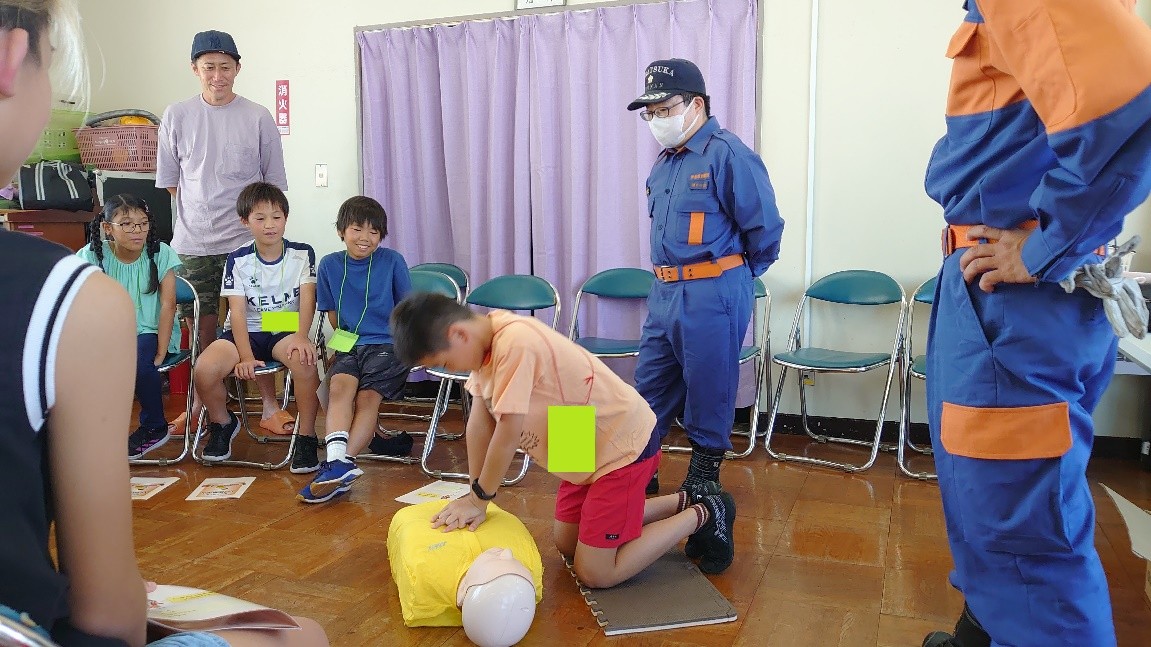 地域の小学生を対象に夏休みに「一泊防災体験」の開催しました。心肺蘇生法、AED、水消火器の操作や起震車体験を行いました。また、夜間には、電灯を消しろうそくの中での被災地体験も実施しました。
