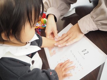 毎月、翌月のカレンダー台紙に子どもの手形や足形をスタンプしてカレンダーを完成させます。制作後は子ども達はおもちゃで遊び、ママ達は会話を楽しみます。