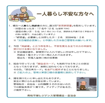 酷暑が続く夏の日に、居住者の一人が、誰にも知られず亡くなっていました。 カラオケ仲間からの問い合わせで自宅訪問、すでに10日ほど経過していました。これを機に、次の1、2のとおり考えました。