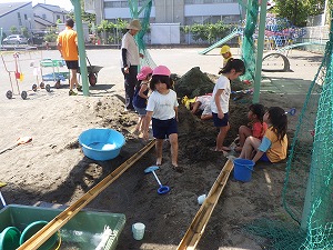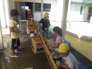 夏に、砂場で竹のといを使ってたくさん水遊びをしました