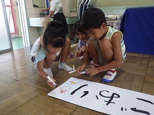 年長つばめ組だけの特別な日「つばめの日」。この日に向けて、みんなでやりたいことを話し合い、協力しながら準備を進めてきました。子ども達が考えた本物のお店「流しそうめんやさん」「バーベキューやさん」「かき氷屋さん」が開店し、子ども達は、お店屋さんになったりお客さんになったりしながら楽しみました。そして、宝探しやキャンプファイヤーもしました。子ども達の思いがたくさん詰まった1日になりました!
