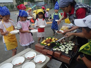 つばめの日に、幼稚園で収穫した野菜やウインナーを焼いて食べました!何度もおかわりに並んだね