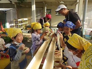 「流しそうめんがしたい!」お家の方に協力いただき、自分たちでそうめん用のといを作りました