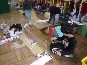1年生との交流から帰ってきて、早速車作りが始まりました。完成した車にひもをつけ、たくさん遊びました。