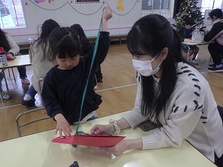 保育参加日で、親子一緒に靴下を作りました 年中組はリボン通し