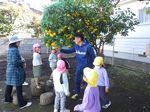 園にあるみかんの木。今年はたくさんのみかんができました。子ども達だけでなく、保護者や未就園児、伸生会さん、ご近所さんにもおすそ分けしました。