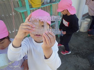 「こんな面白い形発見~!」容器に水を貼っていろいろな形の氷を作りました