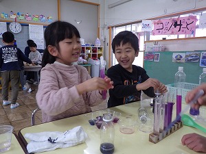 ここは、実験の部屋 色水やスライムの実験を披露しました