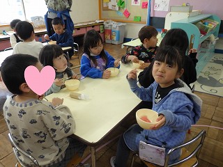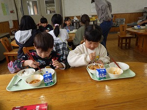 1月、日常的に交流を行っている中原小学校で、年長児が給食体験を行いました。