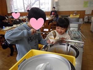 5年生がおかわりをよそってくれました 就学の楽しみが、また1つ増えた子ども達でした