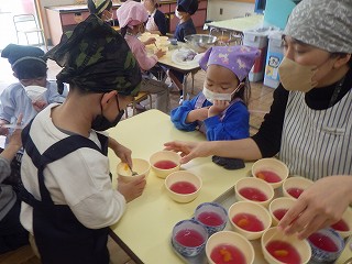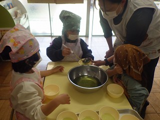 チームに分かれて、いちご、ぶどう、青りんご味のゼリーを作りました