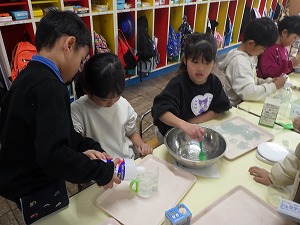 こちらは、スライム実験 友達と協力して、計量カップで材料を量っています
