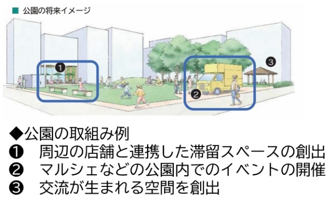 将来構想では新宿公園(通称 はと公園)は、下記イメージのように、周辺の道路や建物を一体的に活用できるような空間の創出を目指すとともに、商店会や店舗が柔軟に活用できる仕組みづくりや、安全・快適に過ごすことができる場として、遊ぶ・休憩する以外にも、イベントの開催や交流が生まれるような機能を創出し、常に活用される公園を目指しています。