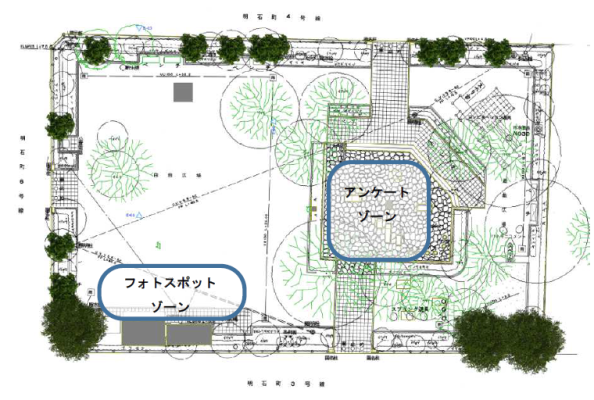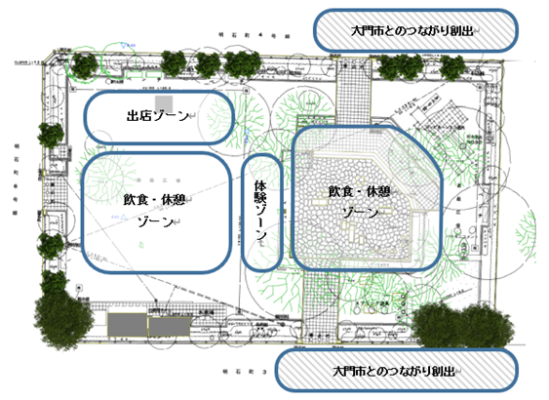 - 飲食・休憩ゾーン・・・大門市や公園内で購入したものを食べたり、来街者が休憩するゾーンです。
