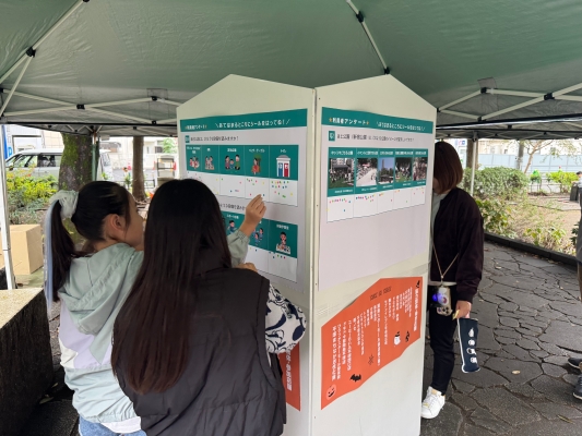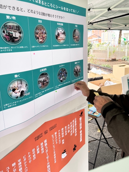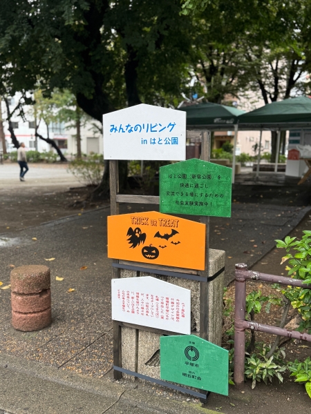 10月26日(日曜日)に実施された明石町会のハロウィンイベントと連携し、地元住民であるイベント参加者から意見を聴取する社会実験を実施しました。公園内に将来の公園整備のイメージにつながるゾーンを創出したなかでの意見聴取を予定していましたが雨天であったため、規模を縮小しての実施となりました。