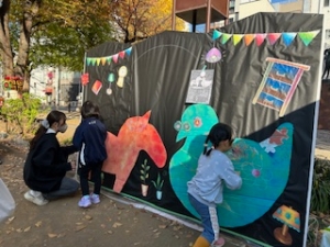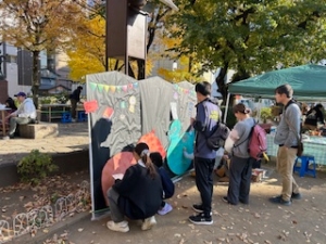 10月26日(日曜日)に実施された明石町会のハロウィンイベントと連携し、地元住民であるイベント参加者から意見を聴取する社会実験を実施しました。公園内に将来の公園整備のイメージにつながるゾーンを創出したなかでの意見聴取を予定していましたが、雨天であったため、規模を縮小しての実施となりました。