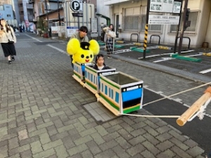 休憩ゾーンの芝生広場では、平塚てづくり紙芝居の会の読み聞かせ、公園内には平塚競輪場のウィンディくんが遊びに来ました。お子様は、大門通りから新宿公園をつなぐ手作り列車に乗車して新宿公園と大門市を行き来しました。