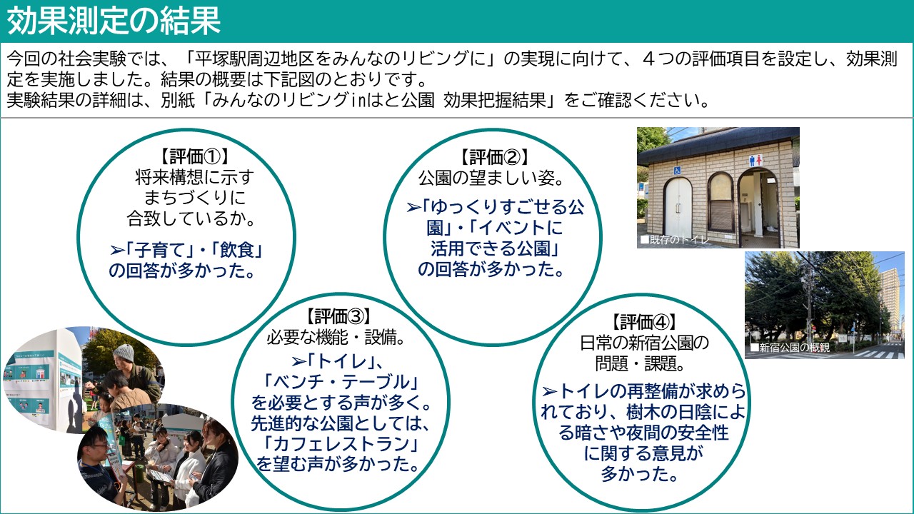 また、実験の際には、今後の整備や公園活用に向けたニーズの調査を実施しました。実験の結果は、現在集計中ですので、整い次第、公表いたします。