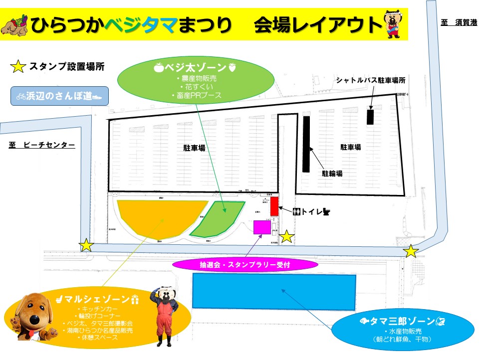 イベント名である「ひらつかベジタマまつり」の「ベジ」は平塚産農産物PRキャラクター「ベジ太」から、「タマ」は平塚の漁業をPRするキャラクター「ひらつかタマ三郎」(外部リンク)(新しいウィンドウで開く)からそれぞれとっています。