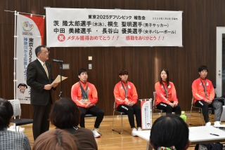 平塚市ゆかりのデフリンピック水泳日本代表茨隆太郎選手、デフリンピック女子バレーボール日本代表中田美緒選手、長谷山優美選手、デフリンピック男子サッカー日本代表桐生聖明選手に出席いただき、貴重な大会報告を聞くことができました。