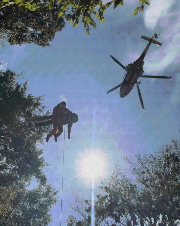 湘南平周辺のハイキングコースで、ハイカーが滑落してしまった場合を想定し、迅速に救出活動を行えるよう訓練を行いました。また、今年は横浜市消防局消防航空隊と合同で、救出した要救助者をヘリコプターで平塚市民病院に搬送するなど、関係機関との連携強化を図ることも含め訓練を実施しました。