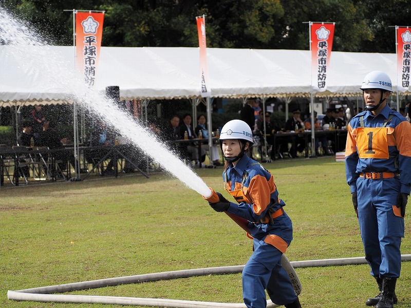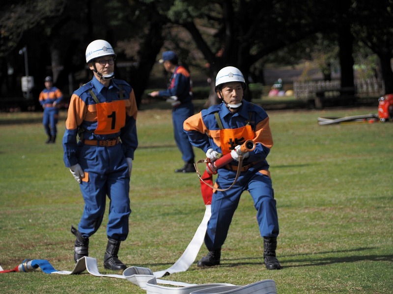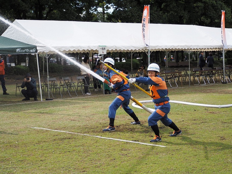 この「操法」とは、4人1組で行われ、消防ホースを3本延長し、放水によって火点標的を倒すまでの安全・確実性と所要時間を評価するものです。