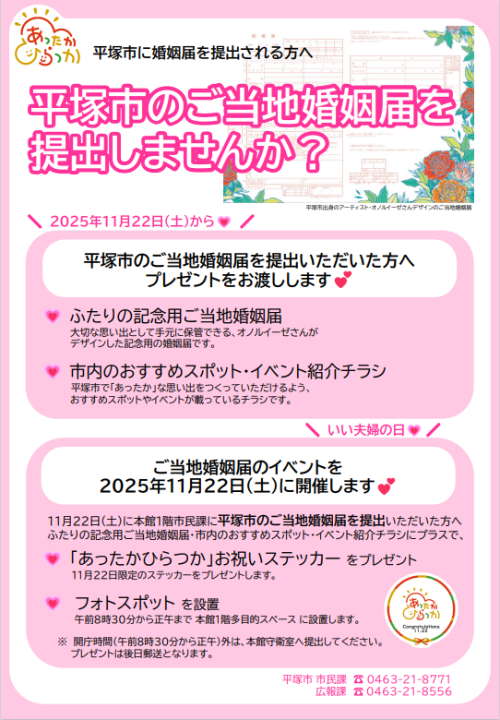 11月22日は「いい夫婦の日」 平塚市にご当地婚姻届を提出しませんか