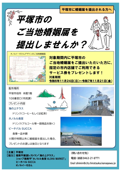 平塚市のご当地婚姻届を提出した方へ、プレゼントをお渡しします。